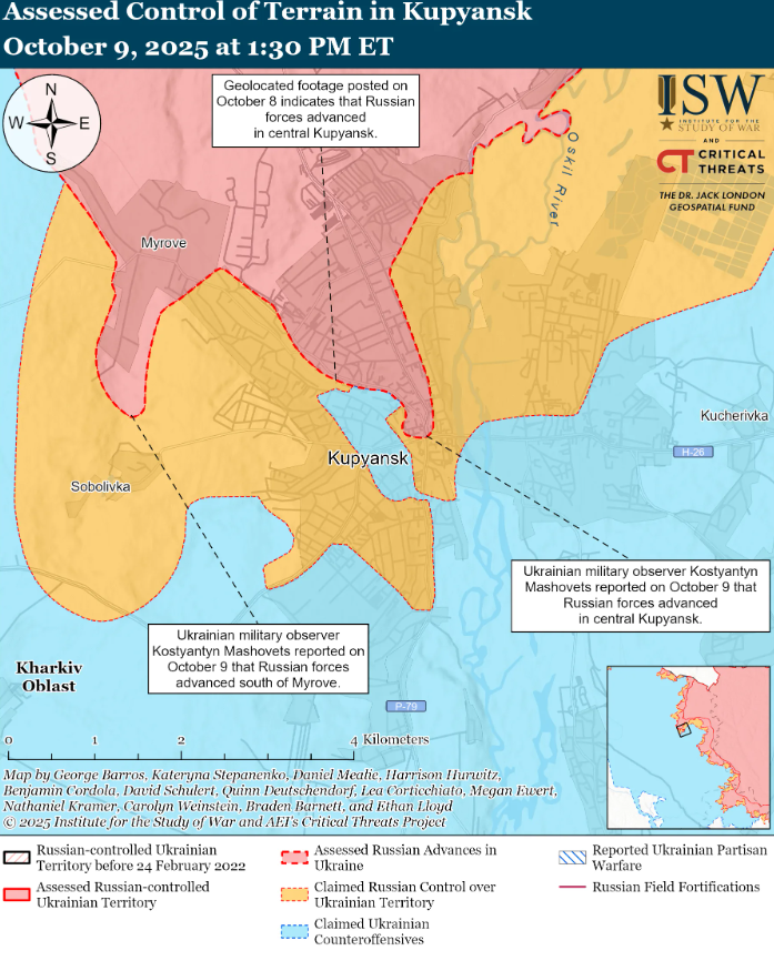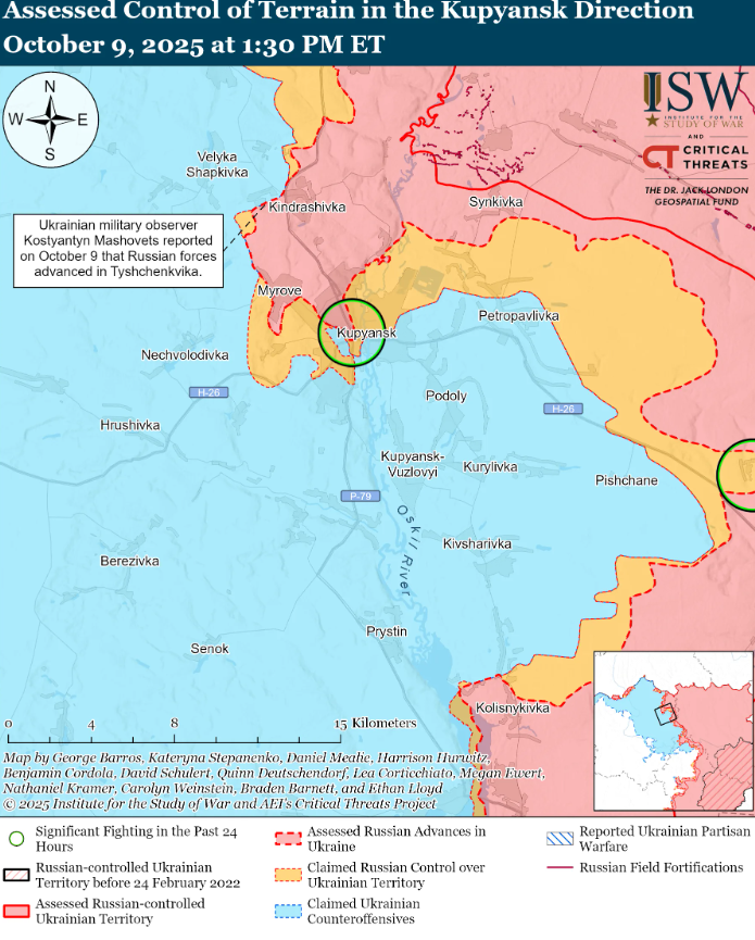 Український військовий аналітик Костянтин Машовець повідомив 9 жовтня, що російські війська просунулися в межах центрального Куп'янська, у південній частині Тищенківки та на південь від Мирового (обидва населені пункти – на північний захід від Куп'янська).