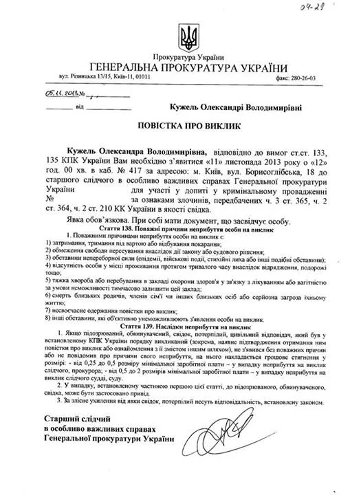 Як зазначає вона на своїй сторінці у Facebook, допит має відбутися 11 листопада о 12:00.