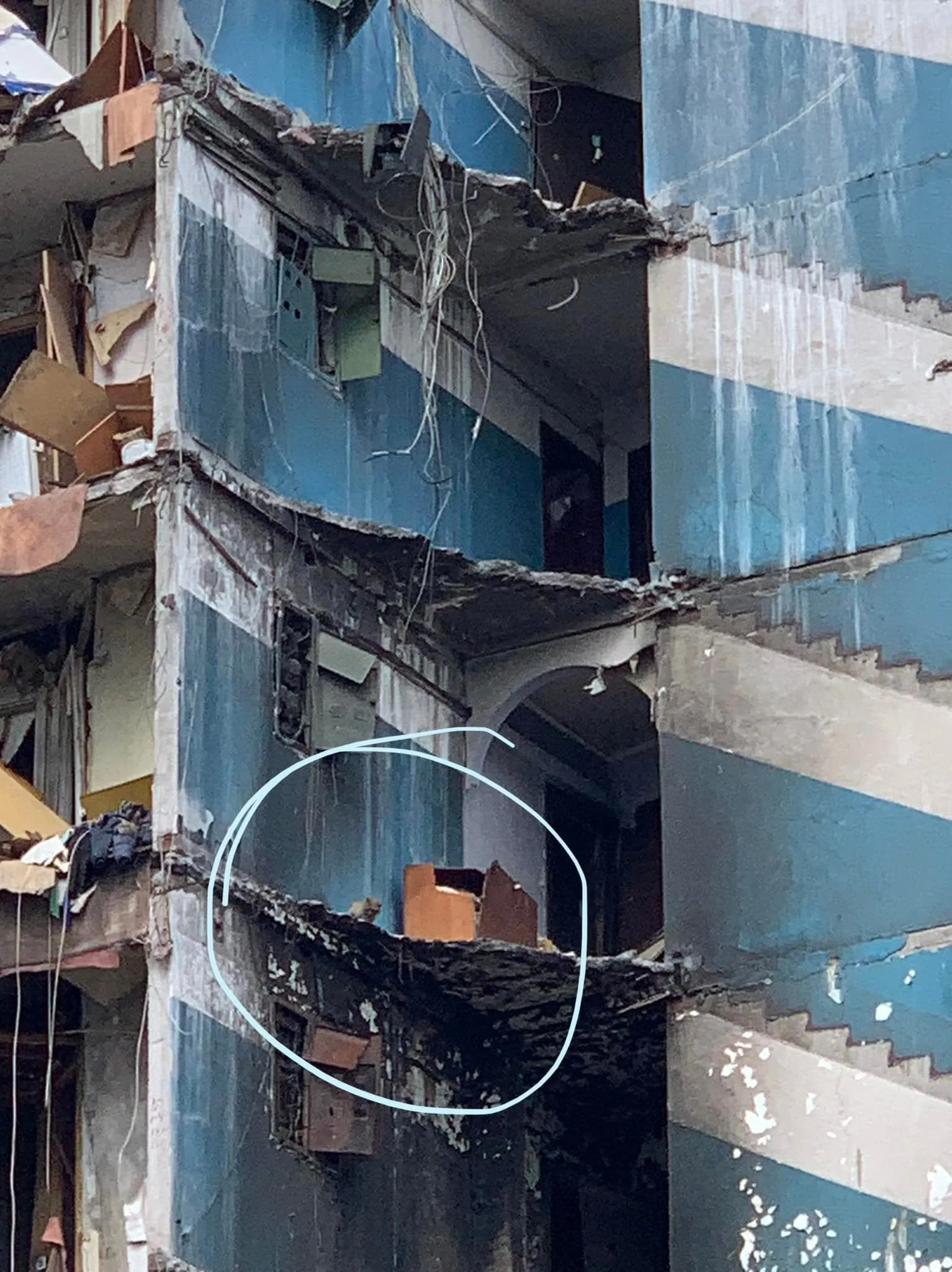 Активіст Євген Кібець просить про допомогу у фейсбуці. Він опублікував світлини практично знищеного будинку в Бородянці, де на 7-у поверсі перебуває кіт.