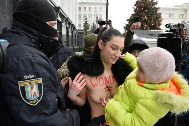 Зрештою до неї підійшли військові й змусили прикритися, накинувши на оголене тіло дублянку. Весь цей час за тим, що відбувається, спостерігала дитина активістки.