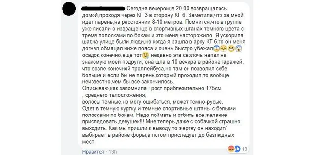 На дівчину, яка поверталася додому вулицею Кадетський Гай, напав маніяк в арці будинку №6 у чорній куртці та чорних спортивних штанях з трьома білими смужками. Її насторожило те, що у соціальних мережах вже писали про збоченця.