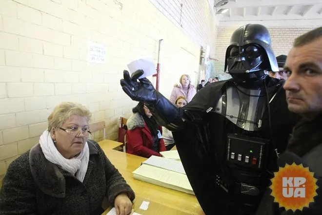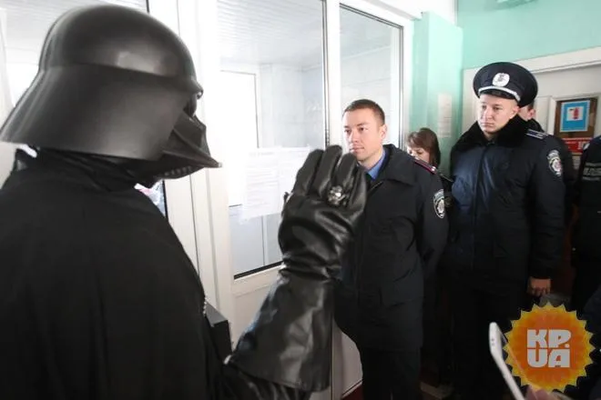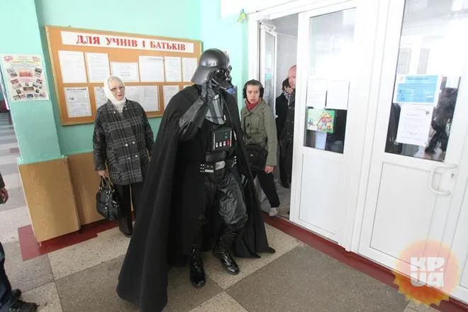 Видання зазначає, що Вейдер, лідер Інтернет-партії України, під'їхав до школи № 256 у Києві на своєму дартмобілі під звуки страхітливого імперського маршу.