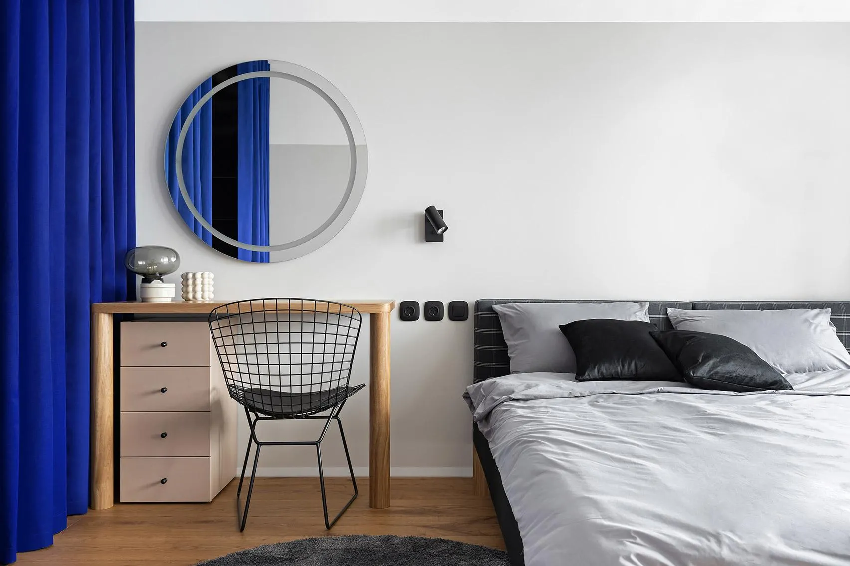 Після реновації залишилась лише одна стіна, яка відокремлює спальню від решти житлового простору. Важкі сині штори лише зонують простір в квартирі.