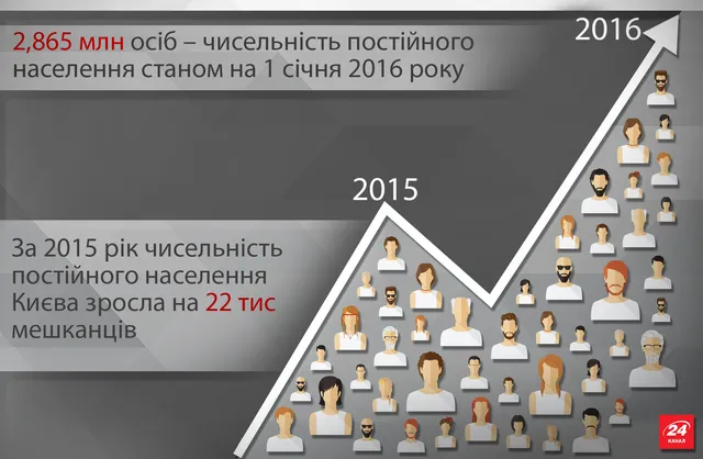 Чисельність постійного населення станом на 1 січня 2016 року досягла 2,865 мільйона осіб, наявного населення – 2,90 мільйона осіб, що більш ніж на 250 тисяч перевищує розрахунковий показник, закладений в Генплані-2020. За один лише 2015 рік чисельність постійного населення Києва зросла на 22 тисячі мешканців.