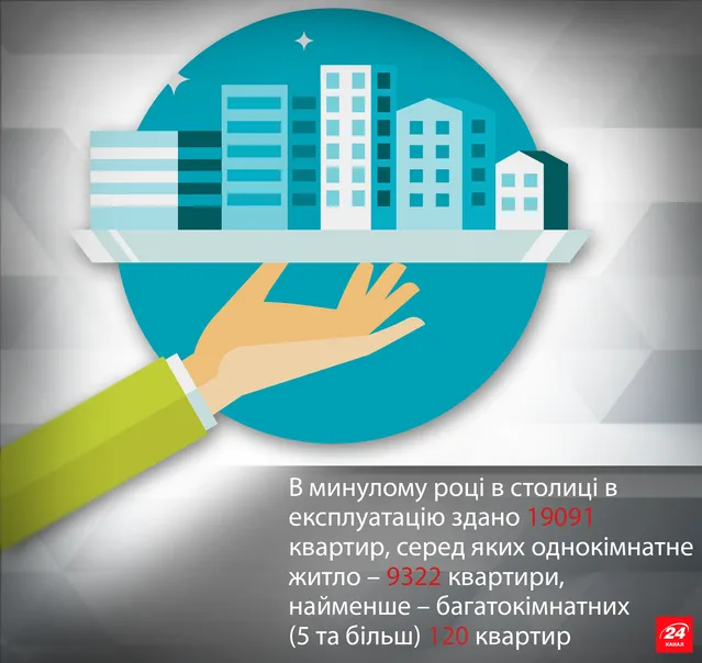Загалом, у столиці в минулому році в експлуатацію було здано 19091 квартир, серед яких найбільша кількість – це однокімнатне житло (9322 квартири), найменше – багатокімнатних (5 та більше кімнат) – 120 квартир.