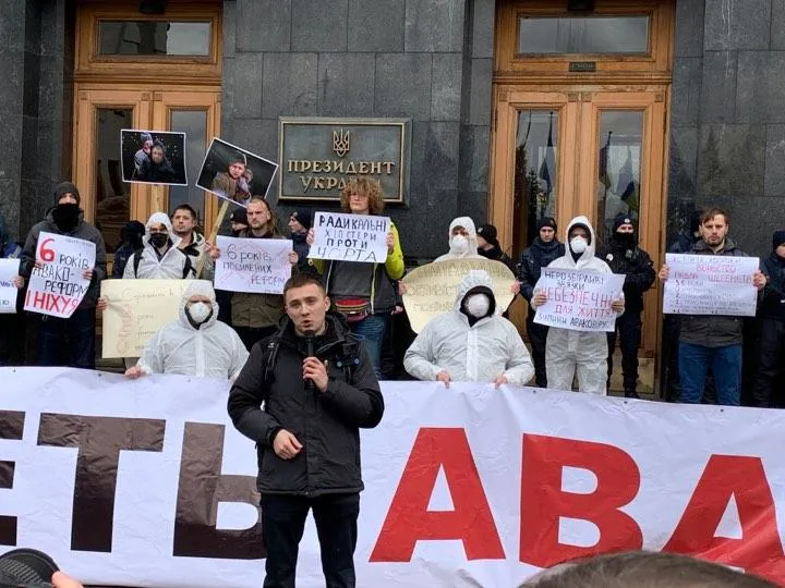 На протест вийшли близько сотні людей, повідомляє журналіст 24 каналу Олексій Печій. Частина активістів одягнуті в білі захисні костюми та медичні маски. Вони наголошують: "легше підхопити Аваковірус, аніж коронавірус".