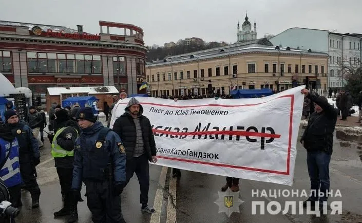 У поліції повідомили, що на Контрактовій площі затримали "організовану групу молодиків із закритим обличчям". Поліція затримала активістів з плакатами із закресленими прізвищами Владислава Мангера та з "Хто замов Катю Гандзюк?". Їх забрали до поліцейського відділку.