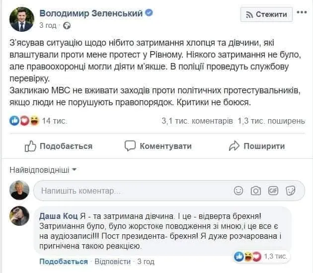 Згодом під постом гаранта з'явився коментар самої затриманої, у якому вона зазначила, що її "жорстоко затримали".