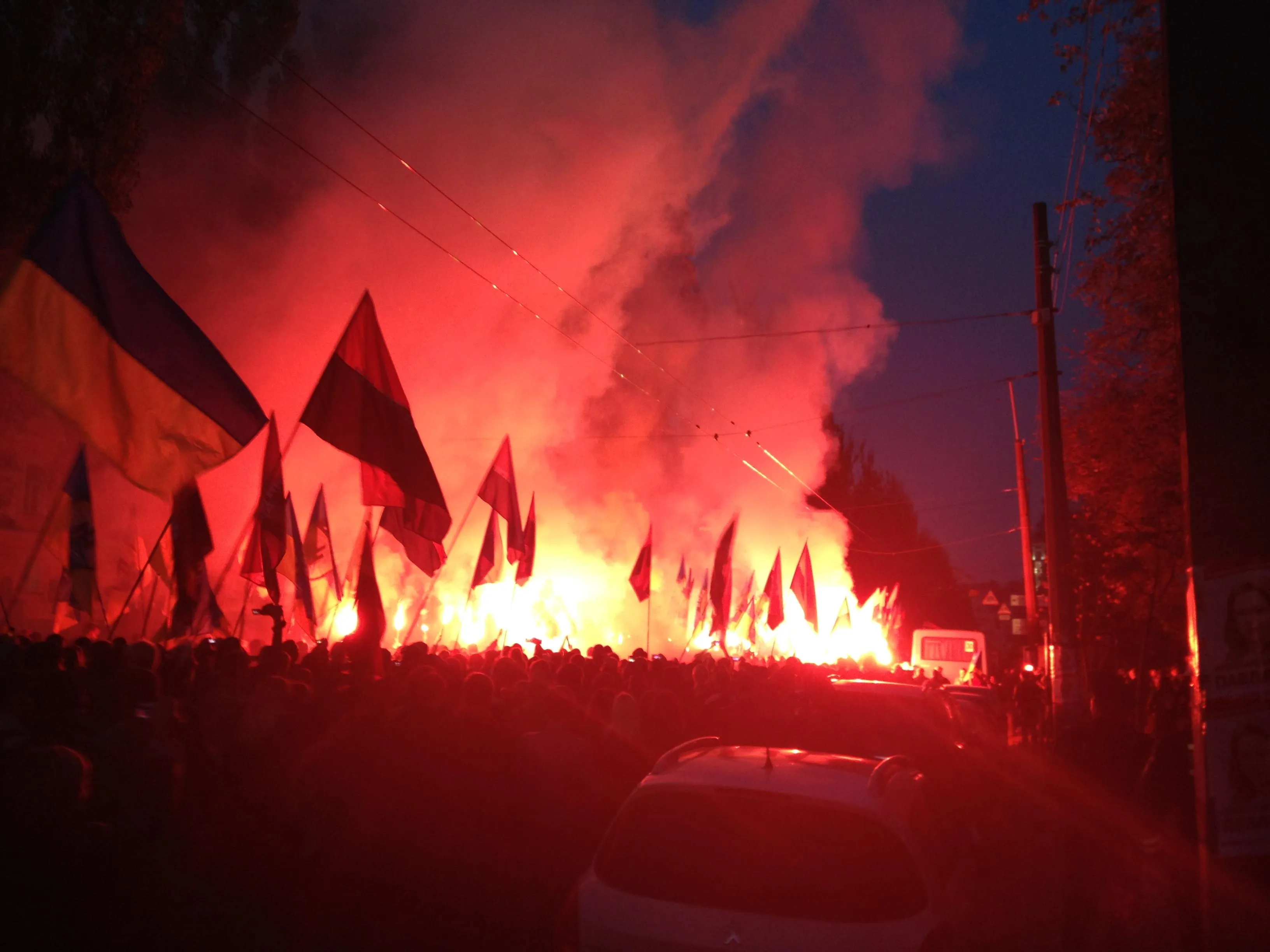 Згідно з повідомленням, учасники маршу несуть прапори Правого сектору та ОУН УПА, половина з них - у балаклавах.