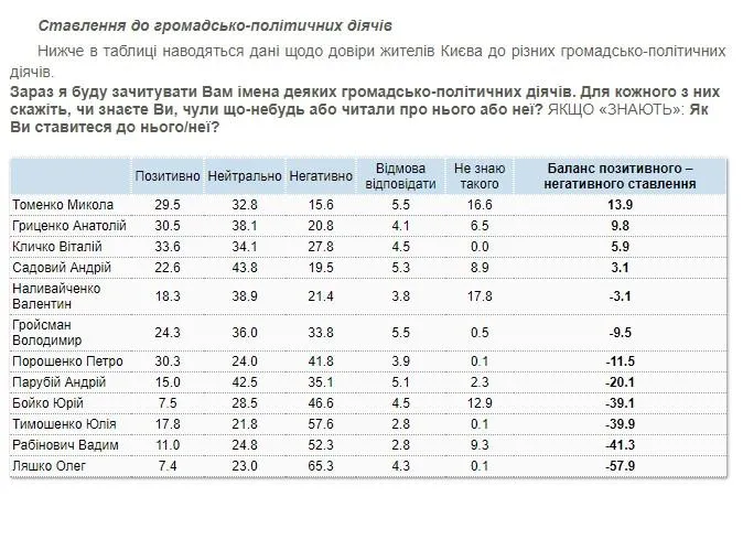 На питання, кому з політиків жителі міста більше за всіх довіряють, опитувані відповіли наступне. На першому місці – мер столиці Віталій Кличко. Йому довіряють 33,6% киян. На другому та третьому місці йдуть відповідно екс-міністр оборони Анатолій Гриценко (30,5%) та чинний президент Петро Порошенко (30,3%).