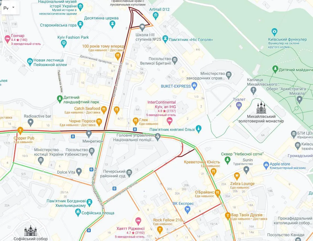 Затори у Києві через ремонт на Михайлівській площі / Скриншот Google maps