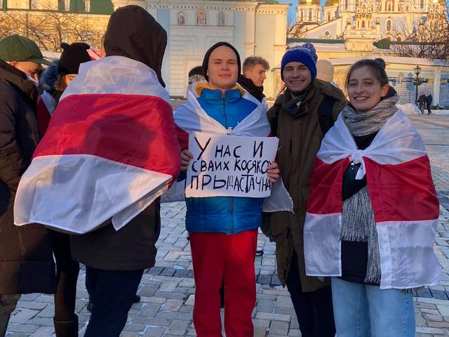 Люди, які зібралися на Михайлівській площі, принесли з собою плакати й на підтримку білоруського народу.