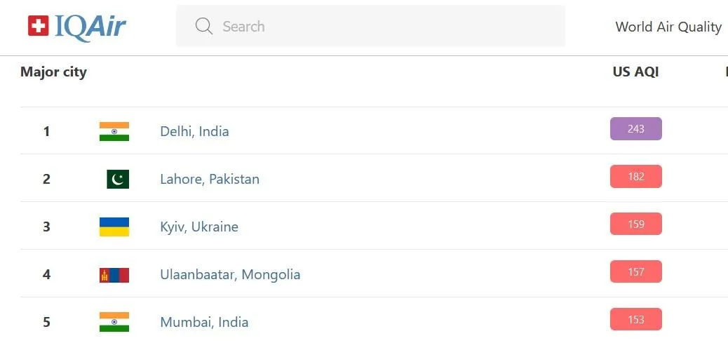 У столиці України знову немає чим дихати. Київ вже другий день поспіль тримається у "призерах" рейтингу IQair. Станом на 12:00 29 жовтня він займає третє місце.