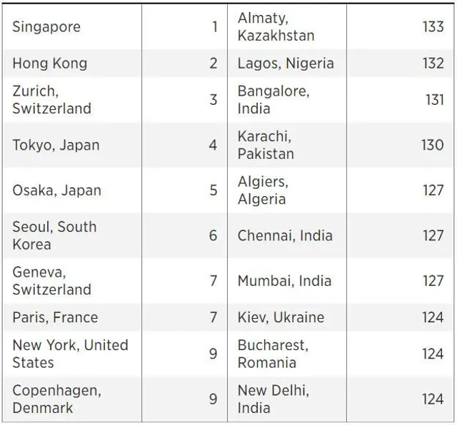 Так, найдорожчим містом визнали Сінгапур. На другій позиції – Гонконг, слідом за ним – Цюрих. Замикають п’ятірку лідерів японські міста Токіо і Осака.