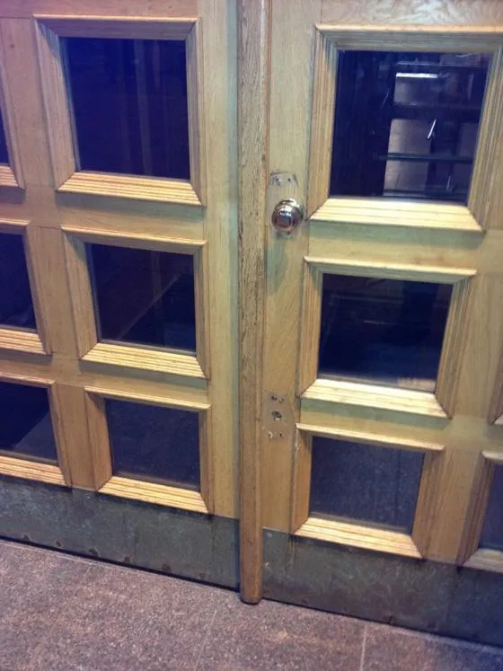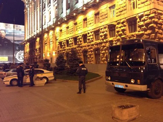 Під будівлею також стоять автобуси з міліцією.З вхідних дверей до будівлі зняли ручки.