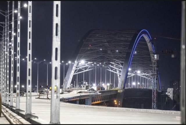 "На завершальному етапі будівництво арочного мосту, який є частиною Подільсько-Воскресенського мостового переходу. Тут вже закінчили монтаж освітлення і тривають роботи з демонтажу тимчасових опор. Змонтовані всі нові ванти, міст почали опускати в проєктне положення. Сьогодні ми увімкнули освітлення на всіх ділянках цього великого об’єкта. Робимо все, щоб до кінця року відкрити автосполучення Подільсько-Воскресенським. А наступним етапом буде будівництво метро на Троєщину", – підкреслив Віталій Кличко.