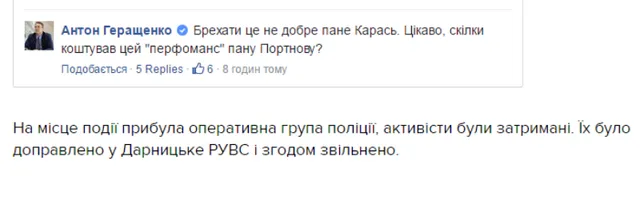 У той же час, радник глави МВС Антон Геращенко в коментарях повідомив, що ці активісти діяли за вказівкою колишнього голови АП за президентства Януковича Андрія Портнова.
