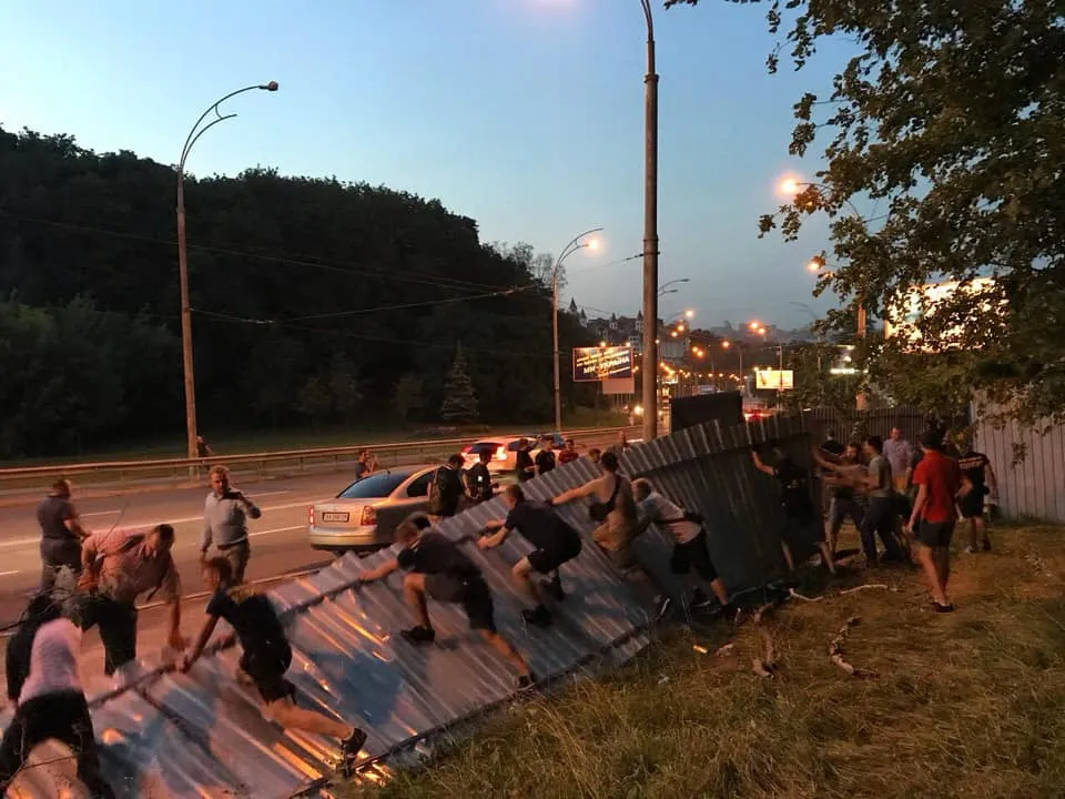 Активісти для перешкодження вирубки почали трощити паркан біля майбутньої забудови.