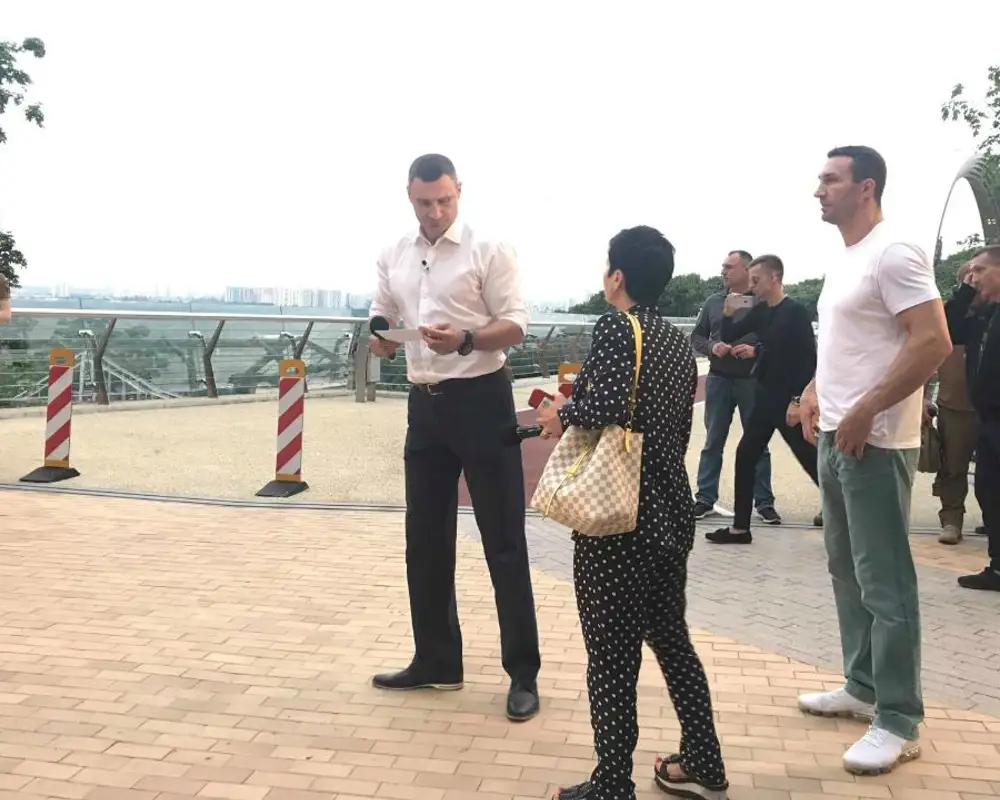 Пішохідно-велосипедний міст, яким з'єднали парки Хрещатий та Володимирська гірка, урочисто відкрили ввечері 25 травня. Тоді ще мер Києва Віталій Кличко разом з братом Володимиром завзято пострибали на скляних частинах мосту.