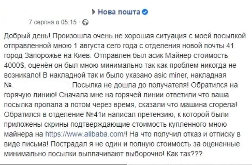 Відправлений був Asic-майнер вартістю 4000 доларів. Оцінений він був мною мінімально, бо проблем ніколи не виникало,