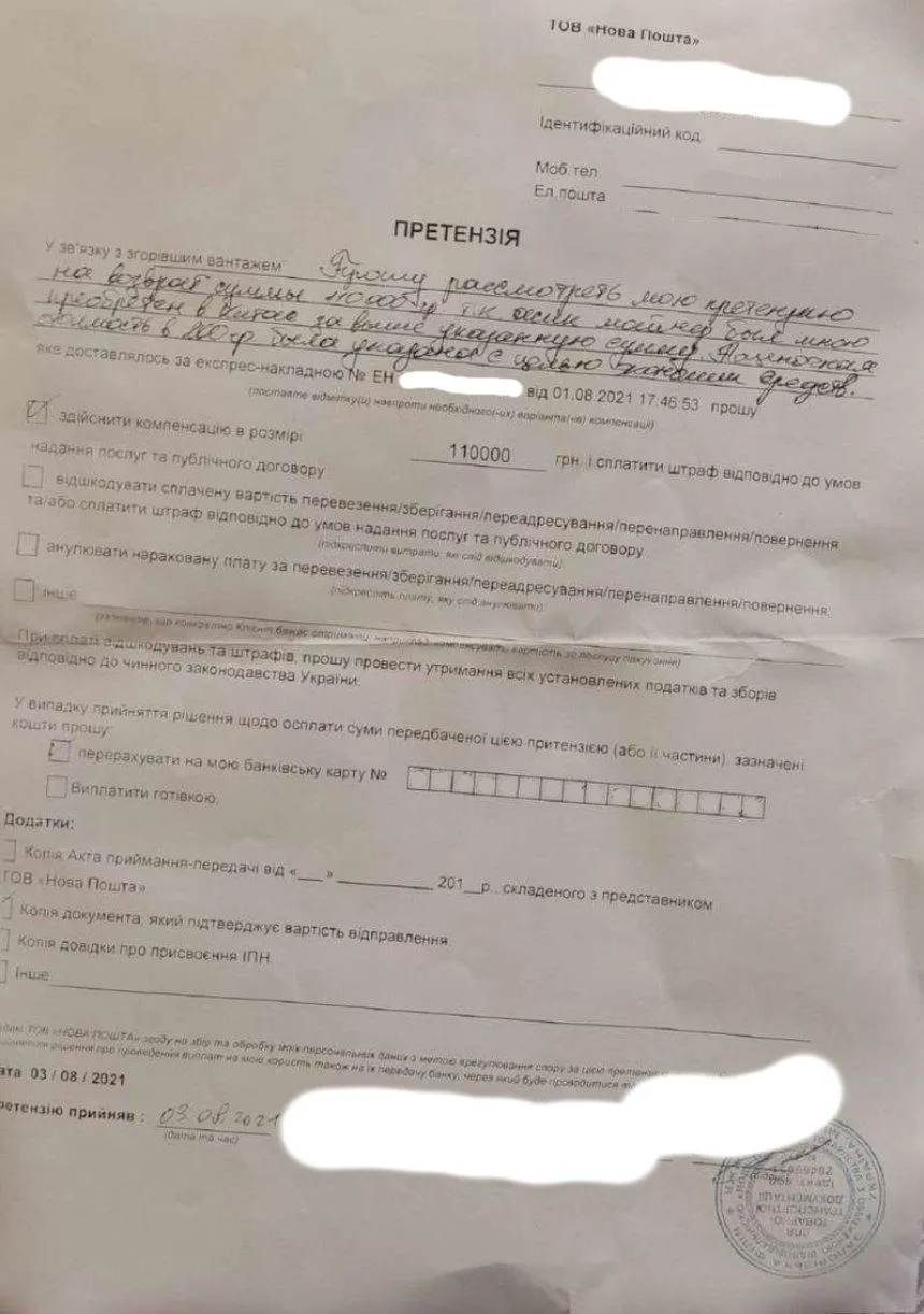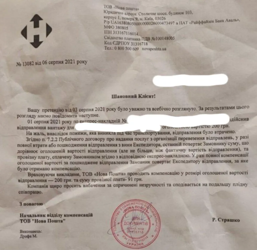 Клієнт написав претензію й вимагав компенсувати йому реальну вартість товару. Однак, компанія відмовилась виплачувати таку суму й запропонували лише 200 гривень, що дорівнювало оголошеної вартості посилки.