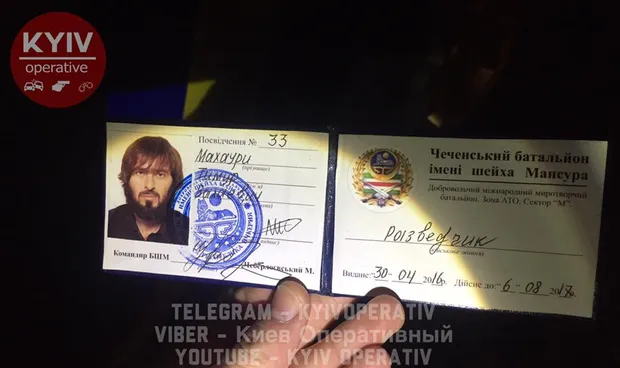 В одного із затриманих було посвідчення на ім’я Тимура Махаури, видане добровольчим міжнародним миротворчим батальйоном "Чеченський батальйон імені шейха Мансура". Вказується, що батальйон базується в зоні АТО в Секторі "М". Сам Тимур Махаури є розвідником. Слід зазначити, що саме посвідчення заповнено двома мовами. Якщо назва батальйону – українською, то ім’я і "посада" затриманого вписана від руки російською.