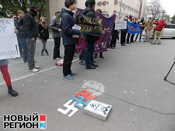 Активісти вважають умови утримання Надії Толоконникової і Марії Альохіної у в'язниці нелюдськими. Вони звинувачують російську владу в фашизмі. Тому свастику також прикріпили до портрету президента РФ Володимира Путіна.