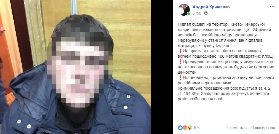 За даними поліції – 24-річний чоловік без постійного місця проживання. Перебуваючи у стані сп’яніння, він підпалив матраци, які були у будівлі. Його вже затримали. Встановлено, що мотиви злочину не пов’язані з релігійними переконаннями. Кримінальне провадження розслідується за ч. 2 ст. 194 ККУ ("Умисне знищення або пошкодження майна"). За підпал йому загрожує до 10 років позбавлення волі.