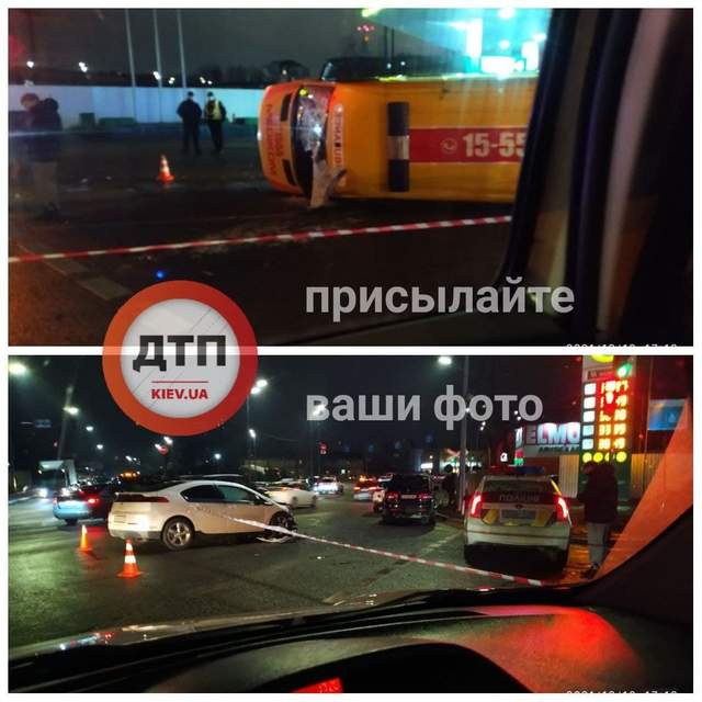 У цей час з вулиці Новокостянтинівської у напрямку центру рухався автомобіль Chevrolet Volt. Він по дотичній вдарив Mercedes медиків, внаслідок чого той перекинувся на бік.