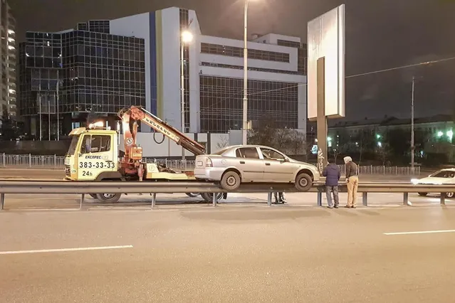 Але далі, замість того, щоб просто скоритись звичним законам фізики, авто незрозумілим чином "заїхало" на відбійник.