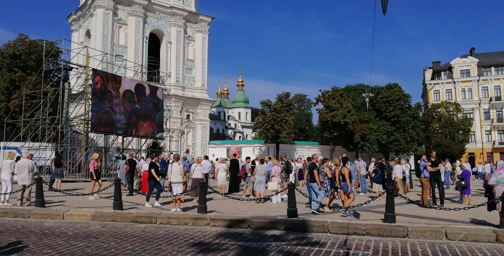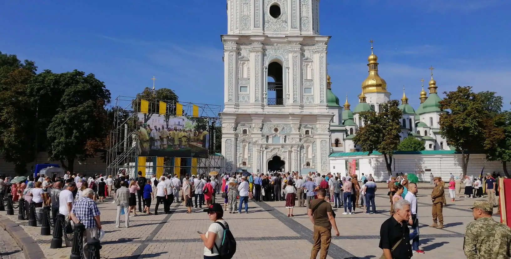 Кореспондент 24 каналу у прямому ефірі повідомив, що вже розпочалася літургія з нагоди 1031-річниці Хрещення Русі на території Софії Київської. Ті віряни, яким не вистачило місця всередині храму, а це понад 200 людей, спостерігають за дійством з великих екранів на Софіївській площі.
