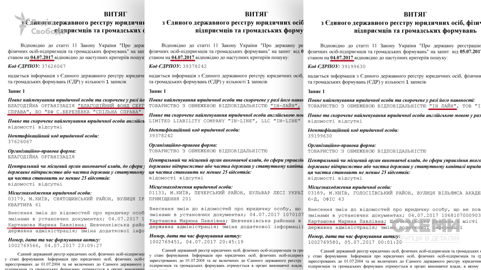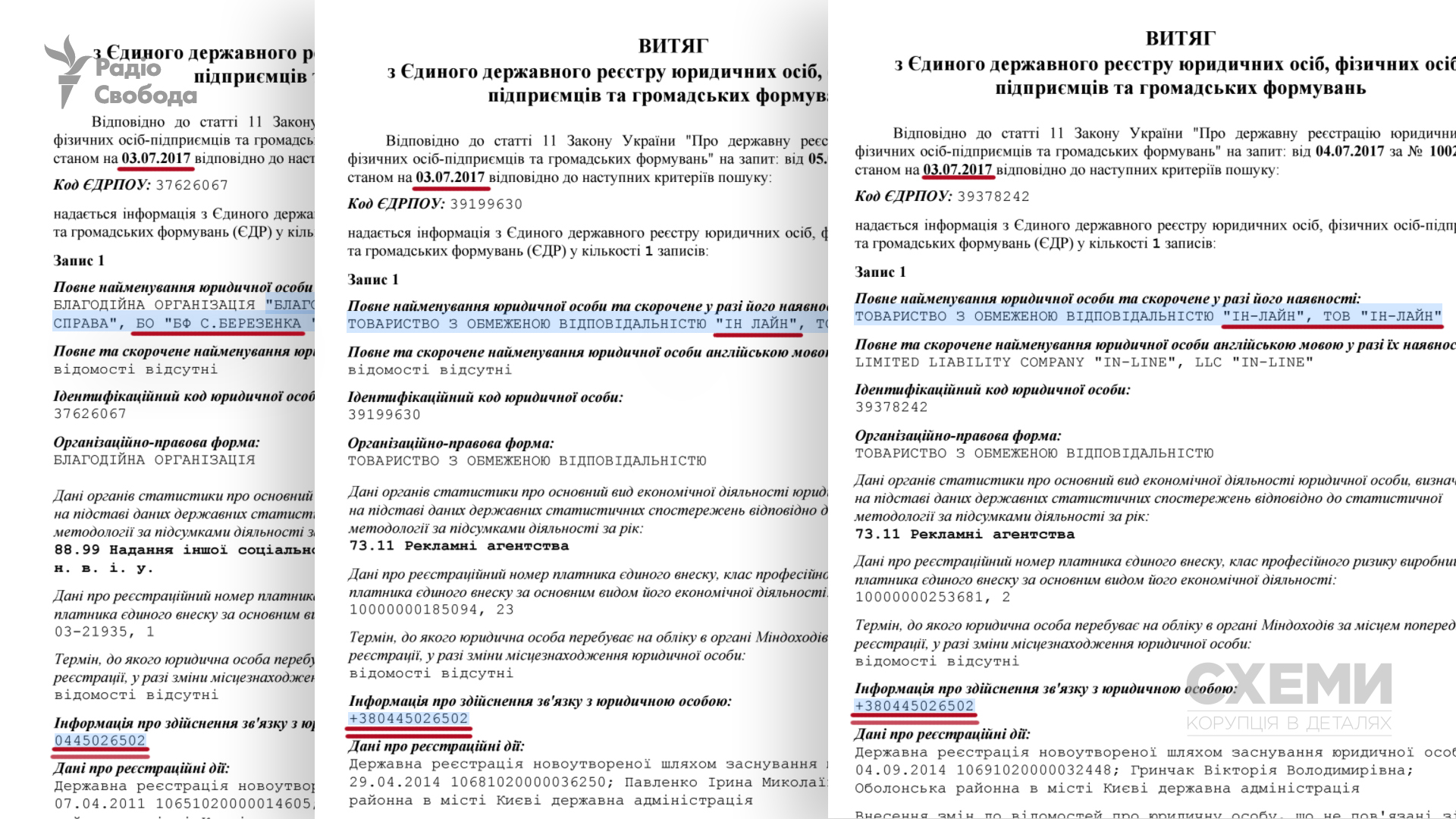 За даними реєстру юридичних осіб, ТОВ "Ін Лайн" до 4 липня 2017 року мало спільний номер телефону (0445026502) із Благодійним фондом Сергія Березенка "Спільна Справа" та з ТОВ "Ін-Лайн". В останньому до квітня цього року частку 25% мала сестра першого заступника голови фракції БПП у Верховній Раді Ігоря Кононенка Оксана Авдєєва.