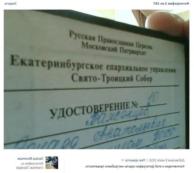 "Під час моніторингу профілів соцмереж російських бойовиків і військових злочинців волонтери міжнародного співтовариства InformNapalm виявили посвідчення громадянина Росії Важенцева Едуарда Анатолійовича, видане Єкатеринбурзьким єпархіальним управлінням Свято-Троїцького Собору Руської Православної Церкви Московського Патріархату", – зазначили волонтери.