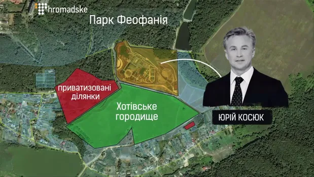 Одна из членов кооператива, который получил землю, призналась, что войти в состав кооператива и получить участок ее попросили. Дальнейшая история раскрыла людей, в интересах которых эта схема и была запущена. Часть земли Хотовского городища отошла одному из самых богатых украинцев – советнику Президента и владельцу ОАО "Мироновский хлебопродукт" Юрию Косюку. Другая часть исторической земли досталась уже бывшему владельцу банка "Михайловский" Виктору Полищуку.