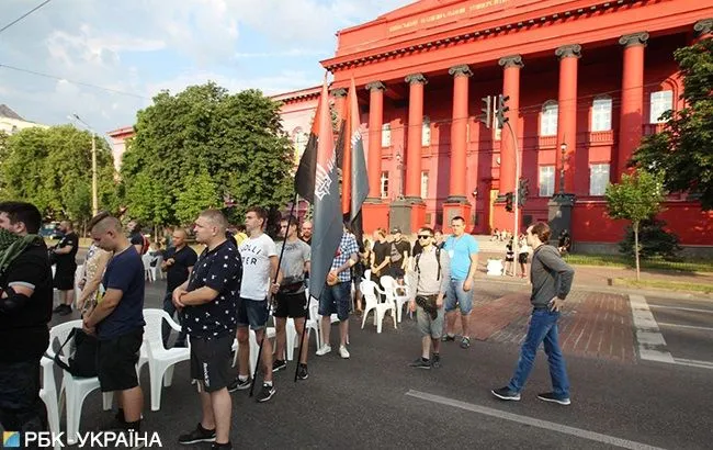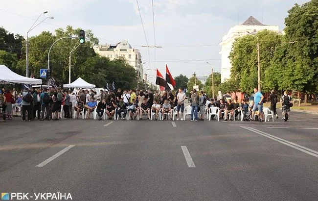 Еще перед началом марша более полусотни молодых людей перекрыли улицу Владимирскую, по которой должны пройти участники Киевпрайда. С собой они принесли пластиковые стулья, которые и расставили посреди улицы.