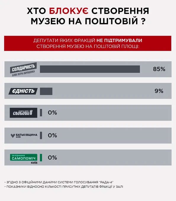 В то же время председатель комиссии Киевсовета по вопросам культуры Виктория Муха презентовала ряд поправок к проекту решения, которые нивелировали всю суть документа. К примеру, речь шла о замене понятий с "инициировать прекращение договора" на "изучить возможность инициирования прекращения договора". Предложения Виктории Мухи вызвали в зале дискуссию и распределили голоса депутатов. В результате, за создание музея на Почтовой площади проголосовали фракции "Объединение "Самопомич", ВО "Батькивщина", "Единство" и ВО "Свобода". В свою очередь, депутаты провластной фракции "Солидарность" за проект решения не голосовали (или воздержались от голосования), что и обеспечило документу "провал".