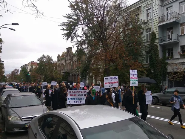 В масках и костюмах нечисти активисты вышли на протест против двух третьих "недолюстрированных" судей, которые попали в новый состав Верховного Суда через конкурс, передает корреспондент 24 Канала в прямом эфире.