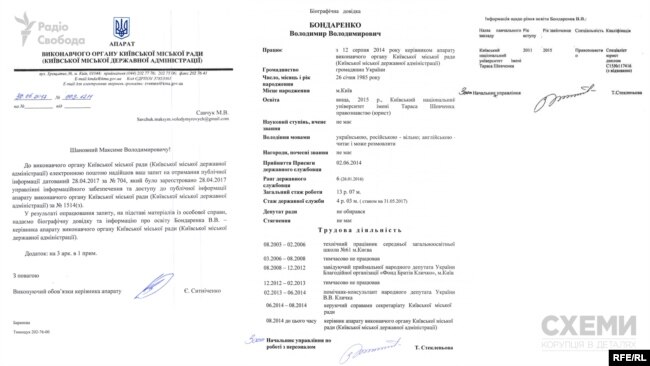 11 мая журналисты программы "Схемы" опубликовали расследование, в котором обнаружили, что руководитель аппарата Киевской горгосадминистрации Владимир Бондаренко имеет поддельный диплом бакалавра Львовского национального университета имени Ивана Франко на основании которого он получил степень специалиста в Киевском национальном университете имени Тараса Шевченко.