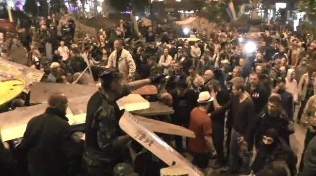 Агентство "Интерфакс - Украина" сообщает, что в ходе драки в толпе использовали взрывпакеты, петарды, есть как минимум один пострадавший. У многих активистов в руках биты, палки и арматура. Многие одеты в камуфляжную форму.