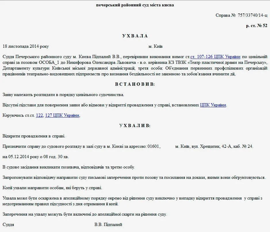 Иск подал коллектив киевского "Театра пластической драмы на Печерске" в лице актрисы Татьяны Цапок, на которую решением трудового коллектива возложили исполнение обязанностей художественного руководителя театра. Ответчиком по делу выступает Департамент культуры КГГА.