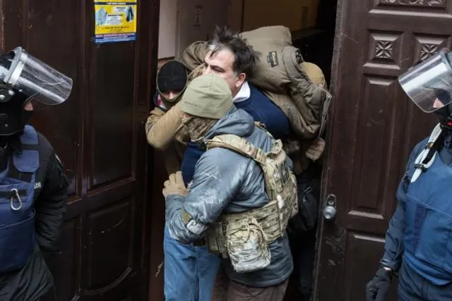 Правоохранителям удалось снять Саакашвили с крыши силой и вручить подозрение. На то время на улице собралась толпа, которая заблокировала выезд буса с задержанным экс-президентом Грузии на улице Трехсвятительской. Активисты ложились под колеса машины, а другие взяли ее в плотное кольцо, продырявив шины. На подкрепление "Альфе" прибыли отряды Нацгвардии, однако ситуацию это не изменило.