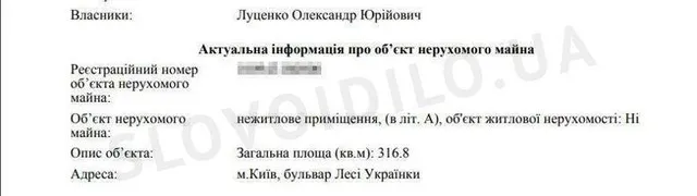 Также на Александра Луценко зарегистрировано нежилое помещение в центре Киева на бульваре Леси Украинки – площадь помещения составляет 316,8 квадратных метра.
