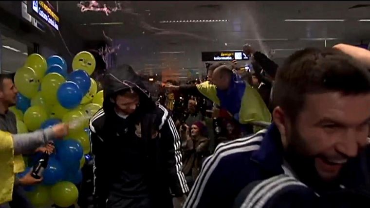 Первым к болельщикам вышел Александр Кучер, его столичная торсида приветствовала очень сдержанно. Но как только из раздвижных дверей появляется президент ФФУ Андрей Павелко и остальная часть делегации сборной — начинается настоящее безумие. Фаны не жалели голосовые связки и наперебой приветствовали футбольных героев с историческим достижением. Игроков засыпали серпантином, конфетти и искусственным снегом. И, конечно же, обильно полили шампанским.
