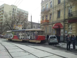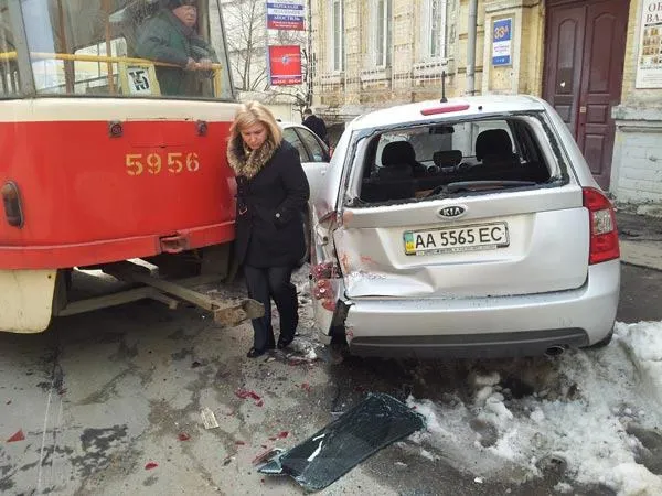 Трамвай врезался в два припаркованных авто - Kia Carens и Suzuki.