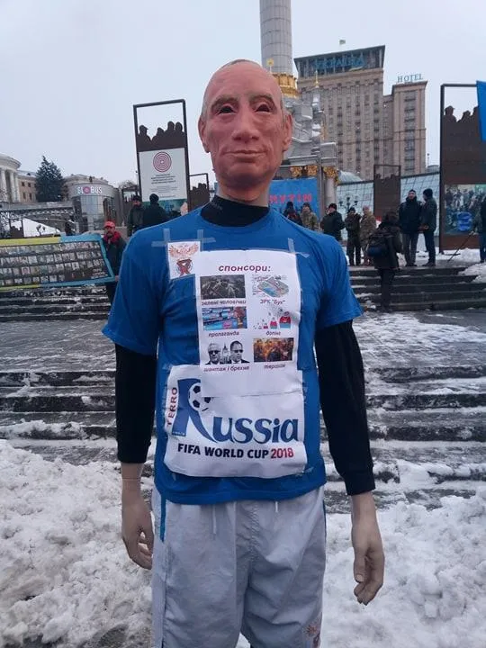 В рамках флешмоба, каждый желающий мог пробить пенальти манекену Путина и высказаться с позицией относительно бойкота футбольного чемпионата в стране-агрессоре.