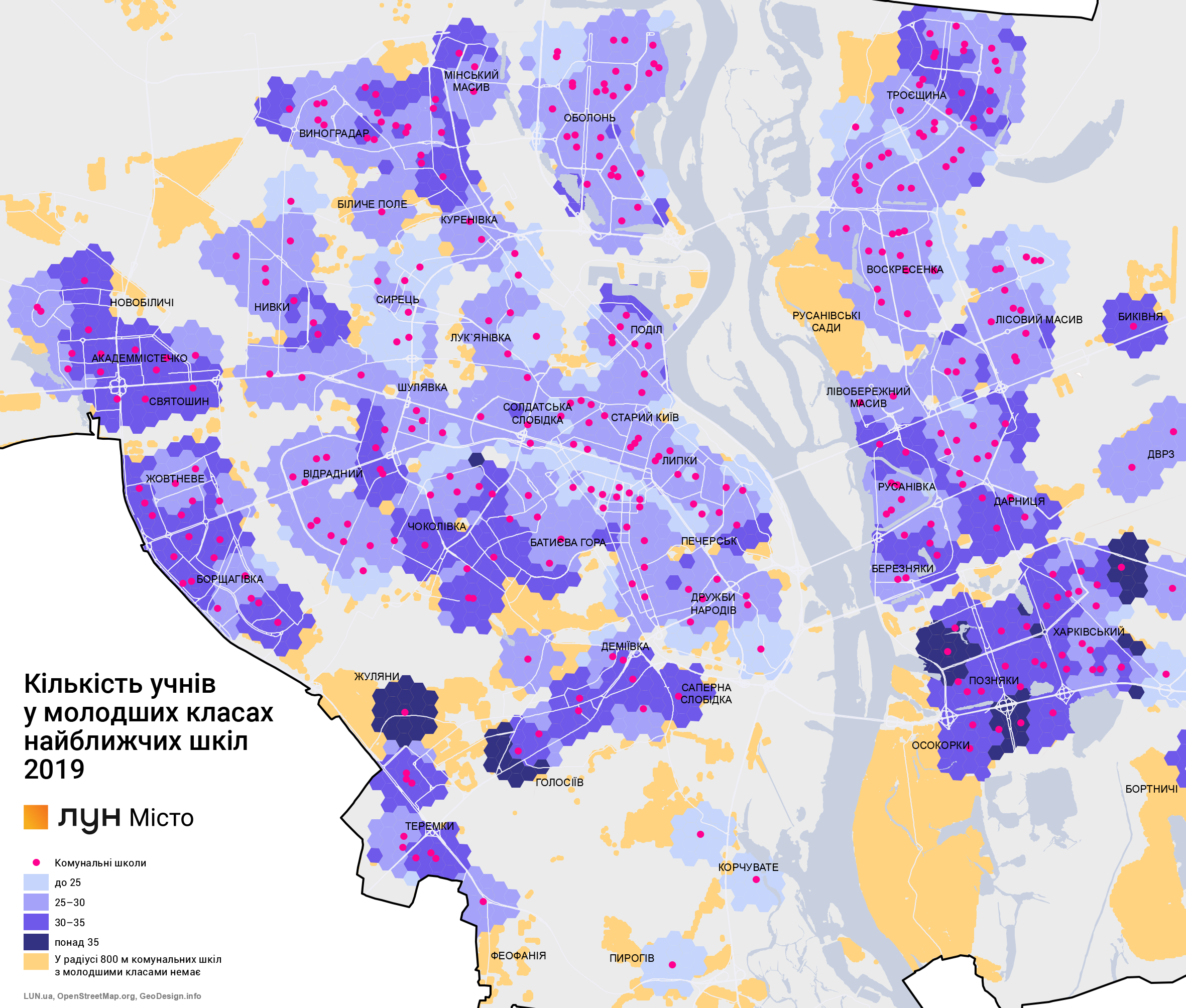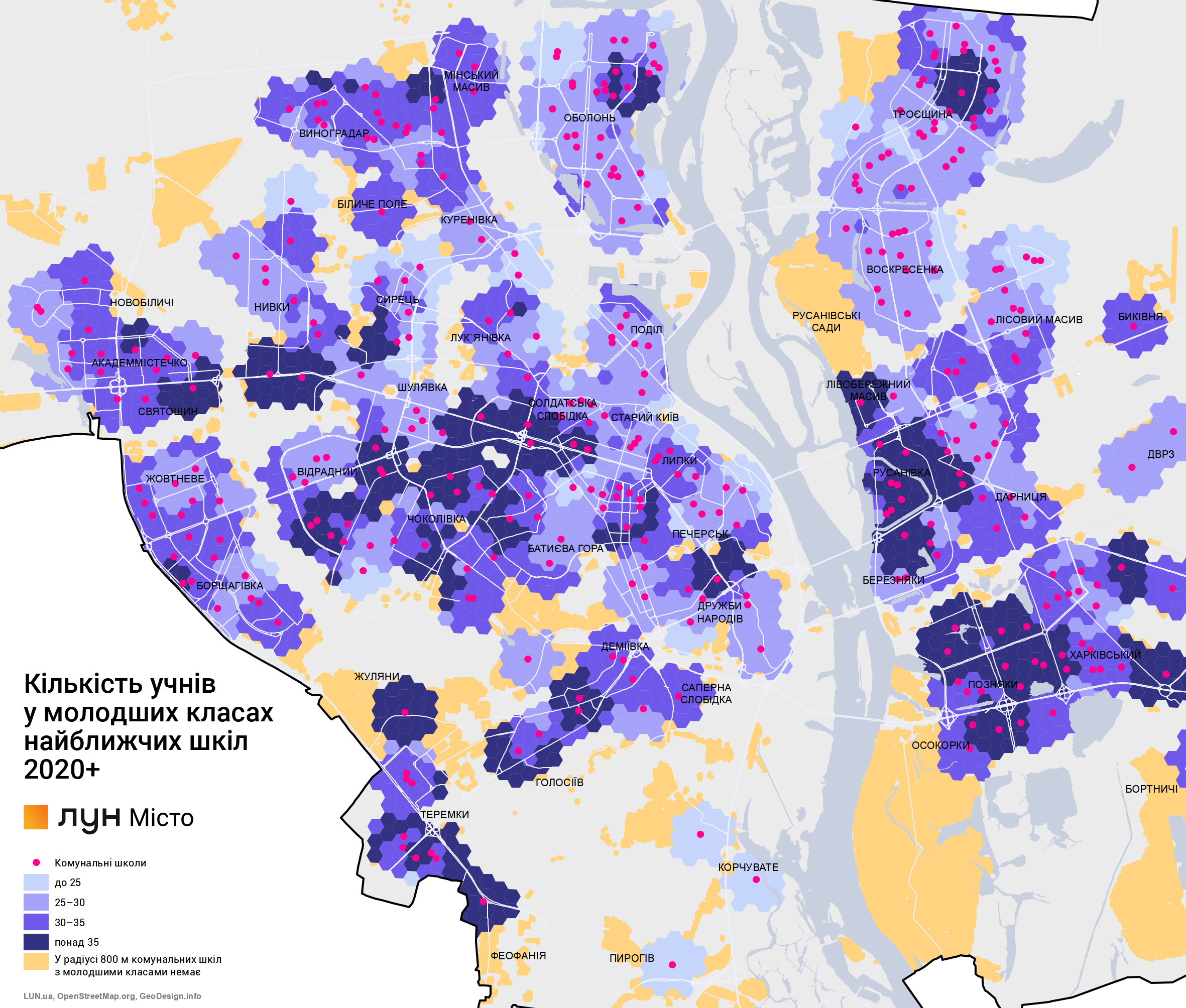 Зараз найбільше дітей у класах молодшої школи на Позняках, Осокорках, Солом’янці, Борщагівці, Святошині, Академмістечку. За кілька років, за прогнозами аналітиків ЛУН Місто, на перших позиціях будуть ті самі житлові масиви – Позняки, Осокорки, Солом’янка, Борщагівка, Святошин, Академмістечко. До списку долучаться частина Троєщини та Русанівка. Максимальну заповненість початкових класів матиме і територія між станціями метро "Університет" та "Політехнічний інститут".