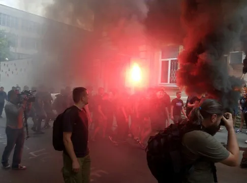 Під будівлею суду активісти запалили димову шашку, а також одягли балаклави.
