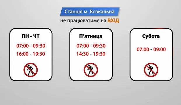 З понеділка до четверга Вокзальна не працюватиме від 7-ої ранку до 09:30 та від 16:00 до 19:30 вечора. У п'ятницю ранковий режим роботи такий же, але вже з 14:30 та до 19:30 Вокзальну закриватимуть знову. У суботу станція не прийматиме пасажирів від 7:00 до 9:00 ранку.
