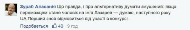 Гендиректор Національної телекомпанії України Зураб Аласанія заявив, що Україна може відмовитись від участі у конкурсі в наступному році, якщо на цьогорічному пісенному конкурсі Євробачення, що зараз триває у Стокгольмі, переможе представник Росії. На думку російського публіциста Володимира Голишева, це істотно підриває шанси перемоги Росії на конкурсі.