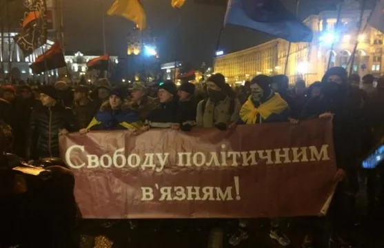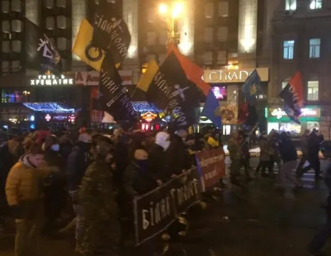 Учасники акції тримають прапори "Правого сектору", "ОУН", "Білого молоту". Зазначимо, що ці ж організації перебували 21 листопада на Майдані Незалежності, коли відбулися сутички.